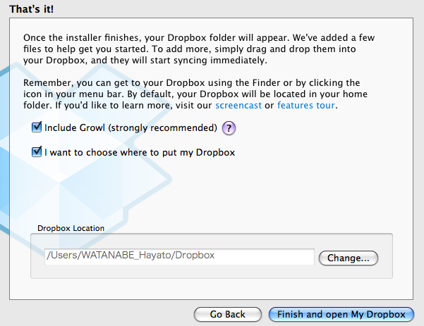 × [PR]上記の広告は3ヶ月以上新規記事投稿のないブログに表示されています。新しい記事を書く事で広告が消えます。 お世話になっている人とDropbox folderをshareすることになったので,Dropboxをインストールすることに.First/Last nameとe-mail, passwardがあればsign-upができて,Dropboxのクライアントをダウンロードすることを要求されます.macの場合は,普通にファイルを保存→ディスクイメージ(.dmgのファイルのこと)を展開して,開いた画面でアプリケーションフォルダにコピーするよう促されるので素直に従う,といういつもの手順を踏めばとりあえずok.