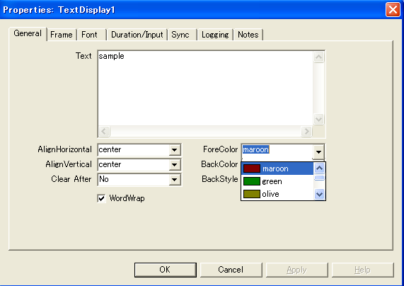 英文であればわりと簡単で、まず、たとえばtext displayとかを設定して、 property(左上にある四角いの)を開くと、たぶん最初はGeneralタブが開かれていると思います。 で、ここの「Forecolor」が文字色、「Backcolor」が背景色です。 Forecolorをmaroonに、BackcolorをMagentaにすると、こんな感じになります。 非常に趣味が悪い色使いになってしまいました… 日本語(2バイト文字)の場合、E-prime 1.x系ですと、文字化けがあって使えないので、 パワーポイントとか、イラストレータ系のソフトでbmpファイルを作って、それを読み込むしかありません。 この場合は、そっちで色を設定する形になります。 E-prime2.0だと、日本語(2バイト文字)も読めるようですので、 たぶんこの方法でイケるんじゃないかと思われます。 なお、イラストレータ系のソフトだと、paint.netがかなりお勧めです。 フリーでは、一番使いやすいんじゃないかなー(他のをそんなに使い込んでいる、というわけではないのですが…) ただ、これはこれで一癖あるので、余裕ができたら使い方を概説したいと思います。